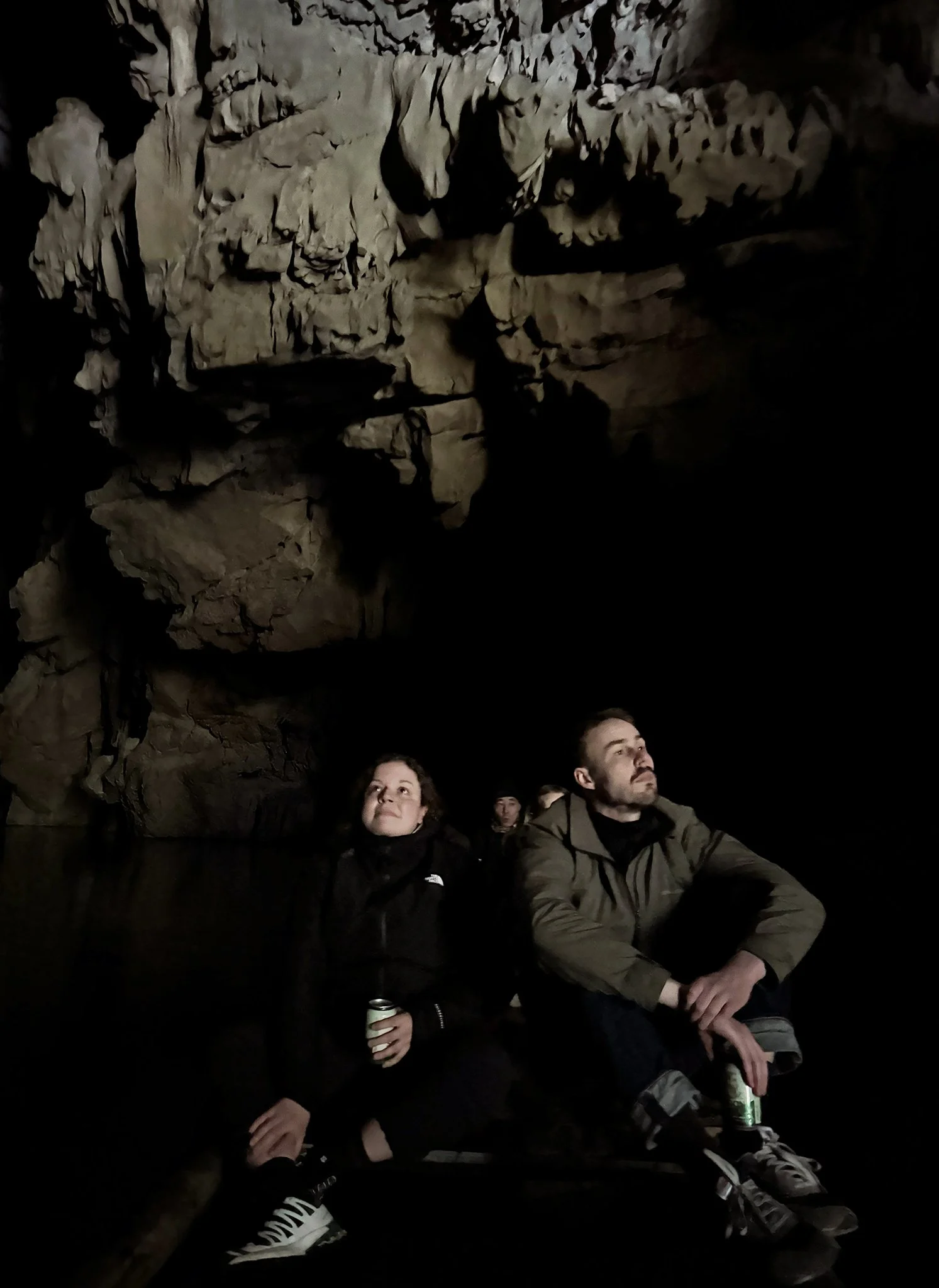 Silhouette of a person walking along a beach with a surfboard in hand, against a backdrop of waves and a distant headland.